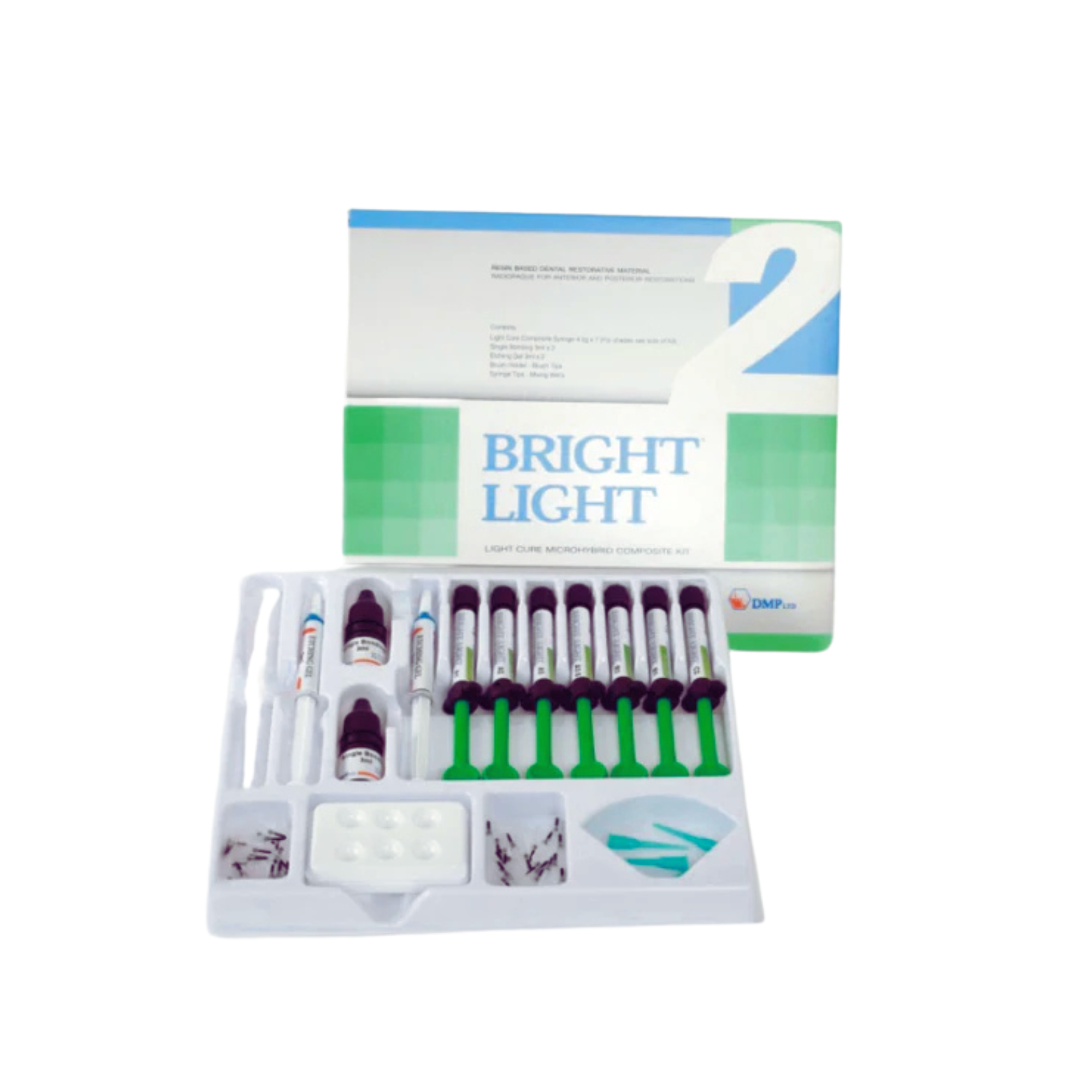 Bright Light is a versatile microhybrid light curing composite for both anterior and posterior restorations. Its great handling characteristics guarantee ease of application while its high gloss polishability increases the resistance against plaque. High filler loading results in excellent physical properties such as high diametral and flexural strength. Due to its very low water sorption it exhibits long lasting colour stability while maintaining its physical properties over a long period of time.