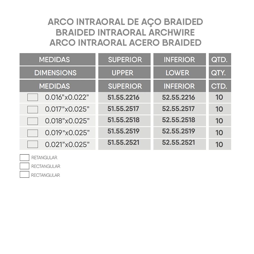 Their characteristics make Braided archwires an excellent transition option between round and rectangular steel archwires, and can be used for the initial stages of torque and rotational control. They are ideal for the final phase of treatment, promoting intercuspation with torque control.